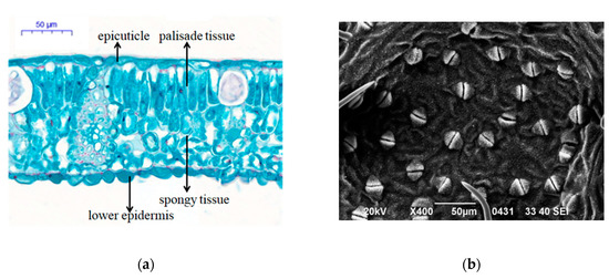 To observe the leaf anatomy, labeled leaves were fixed in FAA (5% formaldehyde, 5% glacial acetic acid, 90% ethanol of 70%), embedded in paraffin wax and then sectioned to obtain transverse sections (10 μm thick), which were stained with safranin-fast green. These sections were dehydrated and their anatomy was observed using an optical microscope of Nikon Eclipse (Nikon, Tokyo, Japan) and photographed using a Nikon DS-U3 (Nikon, Tokyo, Japan) [44]. Case Viewer software was used to measure the following anatomical structure indicators: cell tightness rate (CTR) = palisade tissue thickness/leaf thickness; scattered rate (SR) = spongy tissue thickness/leaf thickness [45]. To calculate stomatal density, labeled fresh leaves were sprayed with gold and observed and photographed using a scanning electron microscope (Carl Zeiss, Jena, Germany).
