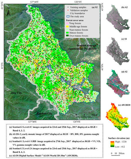 The outline of the study area, sampling sites, and employed open-access satellite remote sensing data derived from Advanced Land Observing Satellite (ALOS), ALOS-2, Sentinel-1, and Sentinel-2 series. Date include (a) Sentinel-2 Level-1C, (b) ALOS-2 yearly mosaic, (c) Sentinel-1 Level-1 GRD, (d) Sentinel-2 Level-2A, and (e) ALOS Digital Surface Model products.