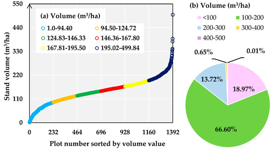 The values of measured stand volume. (a) Field sample profiles of volume in the study site from Plot 1 to 1,392; (b) Components of volume.