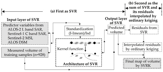 The SVRK model built in this study is the extension of SVR, which integrated SVR prediction and estimation of the residuals by ordinary kriging using Equation (2). SVRK considers spatial parametric non-stationarity with the effects of multi-sensor predictors derived from the benefits of SVR. It also added the spatial dependence of the residuals interpolated through ordinary kriging to the estimated trend, as part of the spatial autocorrelation: