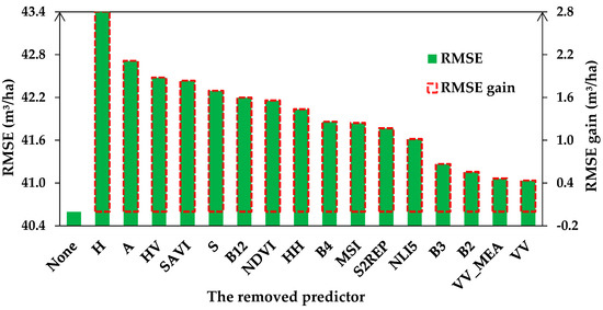 To degrade the redundancy, 15 variables that had r values of the correlation analysis among predictor candidates above 0.8 were disposed [62]. The predictors involved in modeling were the following 16 list in Table 3. After standardization of training data, the optimal SVR model was built by C and σ setting as 1000 and 0.01, respectively, with the minimum RMSE being 40.58 m3/ha. Based on the magnitude of increase in RMSEs (Figure 4), the SVR model showed topographic indicators as the most important predictor for explaining the spatial variations of stand volume, followed by ALOS-2 backscatters, Sentinel-2 indices and texture features of VV channel from Sentinel-1. The VV backscatter from Sentinel-1 was marginal in volume prediction by SVR.