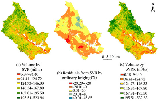 Stand volume mapping by SVR (a), and its residuals interpolated by ordinary kriging (%, divided by the mean measured value of stand volume) (b) as well as final prediction by SVRK (c).