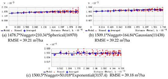 The residuals were calculated by the field-measured volume and SVR predicted values based on training data. The result of K-S showed that volume residuals from the SVR model possessed a normal distribution (p < 0.05), which could be used to calculate experimental semivariograms for ordinary kriging interpolation (Figure 6). Nugget values of spherical, Gaussian, and exponential models were 1478.7, 1509.1, and 1500.5, respectively. Range values were 16.97, 11.44, and 3.16 km, respectively. Sill values were 1689.04, 1673.94, and 1550.52, respectively. The strongest spatial autocorrelation is shown in the spherical model with the largest values of sill relative to nugget. While, the exponential model of ordinary kriging in Figure 6c was chosen to interpolate residuals from SVR with smallest RMSE 39.18 m3/ha. Based on Equation (2), the SVRK model was built.