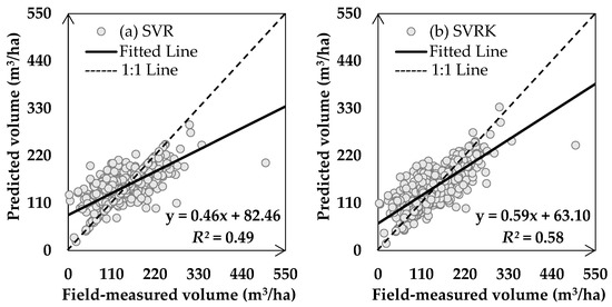 The validation set (Figure 1a) was used to test the performance of volume mapping by SVRK based on the mean error (ME), RMSE, and correlation coefficient between the measured and predicted parameters (r) [70]. In order to better estimate accuracy, the mean measured value of stand volume (146.1 m3/ha in Figure 2a) was applied to divide the ME and RMSE. The relative improvement (RI) based on RMSE of SVRK over SVR was used as another index for accuracy evaluation [25].