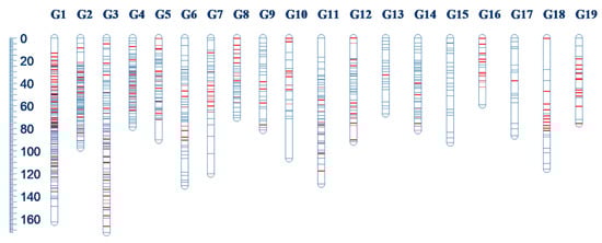 Distribution of 869 segregating markers among 19 linkage groups of Eucommia ulmoides. Red lines represent new SSR markers added on the linkage group. The genetic distance (cM) and linkage group number are shown on the left and top, respectively.