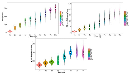Tree height traits showed a significant correlation between different years (except 2010 and 2011), which was consistent with the results for ground diameter, while crown diameter showed no correlation between some years. Tree height and ground diameter showed a significant positive correlation over 10 years. Tree height and crown diameter showed a significant positive correlation in 2010–2015 and 2019 (1a–6a, 10a), but no correlation in 2016–2018 (7a–9a). Tree height and crown diameter were significantly correlated in 2012–2015 and 2019 (3a–6a, 10a), but showed no correlation in 2016–2018 (7a–9a).Ground diameter and crown diameter showed a significant positive correlation in 2012–2016 (3a–7a), but no correlation in 2017–2019 (8a–10a) (Table S3).