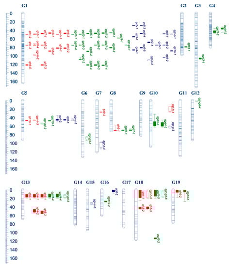 In this study, the QTL loci identified in G1, G5, G8, G13, G18 and G19 were associated with two or three traits. The results of the phenotypic correlation analysis revealed plain positive correlations among tree height, ground diameter and crown diameter in E. ulmoides. The QTLs for different traits with high correlation tend to appear in clusters in H. brasiliensis [], Populus (poplar) [], P. elliottii [], Prunus dulcis (almond) [] and J. regia []. It was generally inferred that the gene may regulate and control the expression of multiple traits or that, QTLs/genes were linked closely [,].