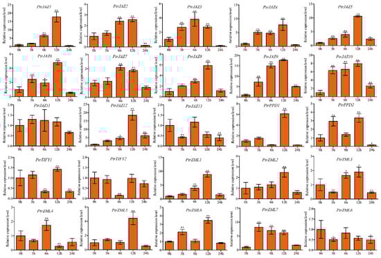 3.6. Expression Pattern of PtrTIFY Genes Under ABA, MeJA, and SA Treatments