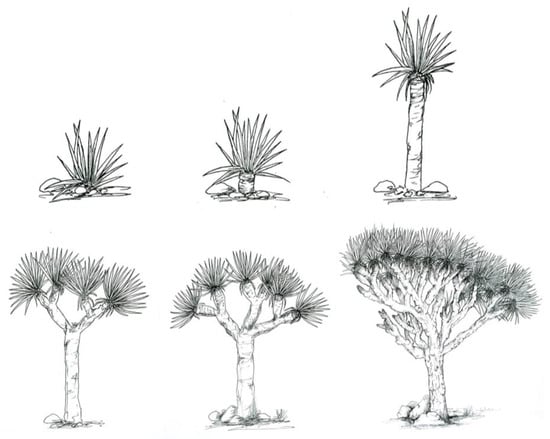 The limited number of studies focused on the population status and structure of dragon trees clearly indicate the high level of threat facing these iconic species. Overgrazing [1,3,35], aridification [14,23], global climate change [21], long-term climate oscillation [42], cutting of leaves [22,30], dragon’s blood harvesting [13], and to some extent mine extraction and road construction [4] are mentioned as key factors of dragon tree population decline.