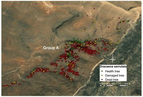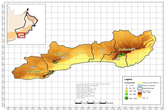 During the population census of D. serrulata from the Dhofar Mountains—Jabal al Qamar, Jabal al Qara, and Jabal Samhan—43,683 trees including juvenile, mature, and standing dead trees were recorded in 2018 (see Table 1 and Figure 2).