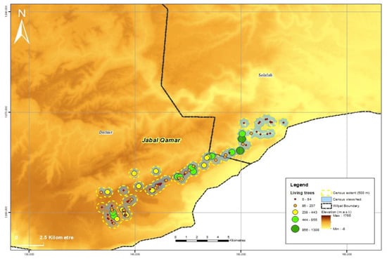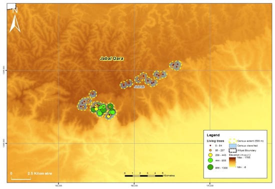 The highest concentration of trees is located in Jabal al Qamar and Jabal al Qara (see Figure 3 and Figure 4). Those populations are also significantly younger than those in the Jabal Samhan population, which accounted for just 20% of the total trees (see Figure 5).
