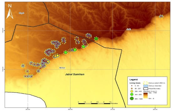 Three isolated populations of the studied species were defined and mapped (see Figure 2). The Jabal al Qamar and Jabal al Qara populations were confined largely to north-facing, inaccessible slopes at an average altitude of 815 m a.s.l. for the recorded trees, with a minimum altitude of 659 m a.s.l. and maximum of 1082 m a.s.l. However, the maximum altitude of visually recorded trees was an altitude above 1200 m a.s.l. The total area of confirmed occurrence at the Jabal al Qamar and Al Qara populations was 14,300 ha. The Jabal Samhan population occupies the steep cliffs and a small portion of the upper plateau. The average altitude of recorded trees was 1160 m a.s.l., with the minimum altitude 1075 m a.s.l. and a maximum of 1579 m a.s.l.: no trees were observed above this altitude. The total area of confirmed occurrence of the studied species in Jabal Samhan was 8400 ha.