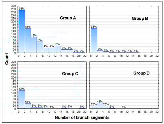 Histograms of the age structure of inventoried groups described by the number of branch sections. Group A is the Jabal Samhan population, B and C are populations located at the eastern parts of Jabal al Qamar, and group D is located at the western part of Jabal al Qamar.