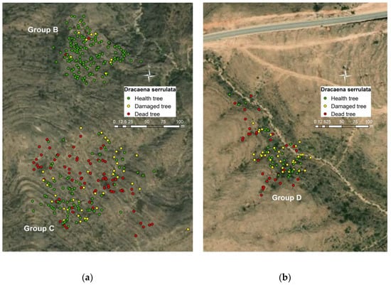 To analyze and compare the structure and health status of the inventoried groups of trees, the whole dataset was separated into four groups according to geographical location. Group A wasthe Jabal Samhan population (Figure 6), groups B and C werepopulations located at the eastern parts of Jabal al Qamar at the southern oriented slopes of the western part of the Dhofar mountains (see Figure 8a), and group D is the population in the western part of Jabal al Qamar situated in several shallow canyons at a higher plateau of the west part of the Dhofar Mountains (see Figure 8b).