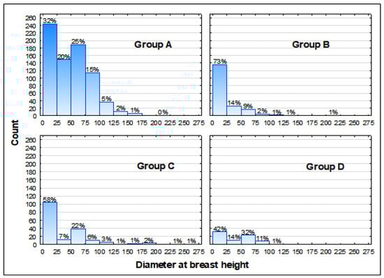 Histograms of diameter at breast height (DBH) structure of the inventoried groups. Group A is the Jabal Samhan population, B and C are populations located at the eastern parts of Jabal al Qamar, and group D is located at the western part of Jabal al Qamar.