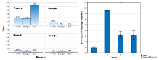 There was a significant difference in the health status of the studied populations (Figure 10 a,b). Group A was the most damaged, and group B wasthe healthiest. Based on 95% confidence intervals of means, there was no difference between groups C and D in the percentage of undamaged rosettes. Group A had the lowest and group B had the highest percentage of undamaged rosettes.