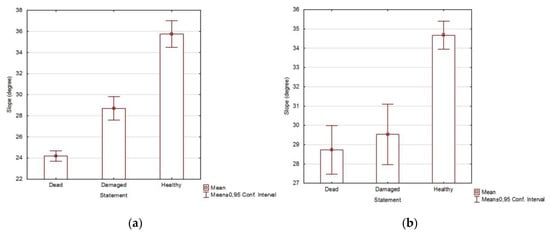 Relation of the slope of terrain and health status of trees in Jabal Samhan population (a) and Jabal al Qamar/Qara population (b).