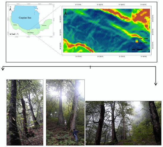 The study was conducted in Kheyrud forest, which is an experimental forest located in an 80 km2, unmanaged section of the greater Hyrcanian forests in Mazandaran province in northern Iran (Figure 1). Kheyrud forest is located the 7 km east of Noshahr at 36°39′ N, 51°30′ E; datum WGS84. This forest has eight sections, one of which is the Gorazbon section [3]. These areas support about 80 native tree species and 50 native shrub species. The mean annual precipitation, temperature, and evaporation in this area are 1.397 mm, 15.5 °C, and 1.031 mm, respectively. The highest elevation for the Gorazben section is reported to be 1380 m AMSL and the lower northern boundary is located at about 1010 m AMSL. This area is also karst in character, and Calcisols are the main types of soils [23].