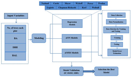 Different models of height and diameter relationships have been presented in the literature. For example, Özçelik et al. [8] modeled height–diameter relationships in southwestern Turkey using empirical models and neural networks. Their results showed that neural network models may be a good alternative to other methods for estimating tree heights. Ahmadi et al. [22] modeled height–diameter relationships in the educational and research forest of Tarbiat Modares University using Weibull, Schnute, and Richards forms of regression, and found that Richards’ model performed the best due to its greater efficiency. Bayat et al. [23] used diameter and height models to obtain the height of Fagus orientalis in the Gorazbon district of the Kheiroud educational research forest of Iran, and showed that the Prodan model had more acceptable results than others examined. Vieira et al. [13] used empirical models, ANNs, and ANFIS models to obtain the diameters and heights of trees of eucalyptus. They concluded that the ANN and the ANFIS models had greater accuracy than empirical models in diameter and height estimation. Nguyen Thanh et al. [24] examined the usefulness of nonlinear equations and ANN models for describing height–diameter relationships in three diverse stand densities of a Korean pine plantation, and found that while all models performed well in describing height–diameter relationships, ANN models could decrease the RMSE the greatest. Zhou et al. [11] estimated DBH in a forest area in China using multivariate linear regression and generalized regression neural network models, and found that the latter provided better results with stronger generalizability.