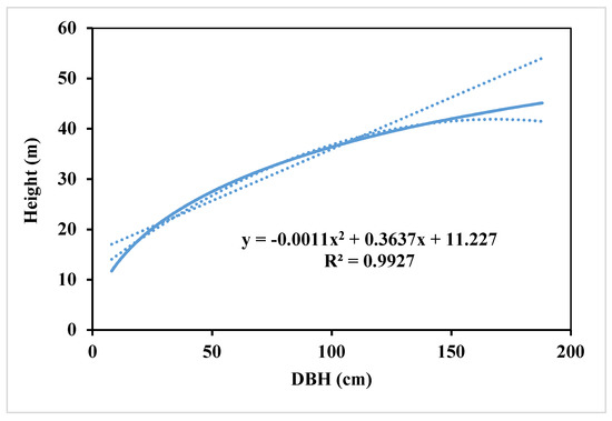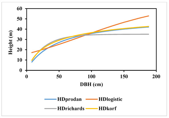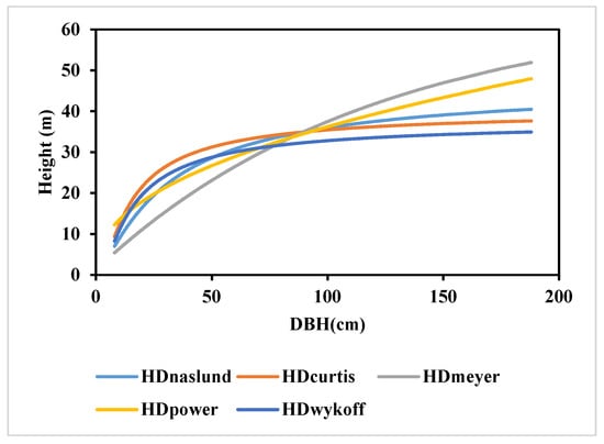 Hyrcanian forests, the only commercial forests in Iran, are considered complete biological communities. They have the highest degree of self-regulation and self-renewal among all natural ecosystems in Iran. Hyrcanian forests can be considered both as a starting point for efforts to maintain an ecological balance in nature, and as a model of irreplaceable pattern in forest science for the application of different methods of forestry [1,2,3]. In concert with new management approaches for forest ecosystems, which can be based on multipurpose forestry goals, managers need accurate and precise diameter–height relationships to assess growth and production in the sustainable management of these resources [4,5]. Hence, diameter–height models are essential to better understand different relationships in nature, as well as to describe and study the differences and effects on forest ecosystem development [4,6,7]. Further, the accuracy of such models is very important for the preparation of accurate volume tables and for the development of growth prediction models [8]. For this reason, forest managers need to be informed of the connection between the diameters and heights of trees, and be able to accurately estimate the heights of trees using diameter at breast height (DBH). Oriental beech (Fagus orientalis Lipsky), commonhornbeam (Carpinus betulus L.), Caucasian alder (Alnus subcordata C.A. Mey), velvetmaple (Acer velutinum Boiss.), and large-leaved lime tree (Tilia platyphyllos Scop.) are the main native species of the northern Hyrcanian forests of Iran, and are the most important and most valuable commercial species. Studying the height and diameter characteristics of these trees is very important and can provide valuable information for the management of these forests by future generations of society.