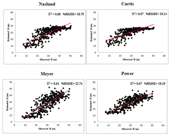 Estimated heights versus observed heights by 10 empirical models (testing R2 and RMSE (%) noted).