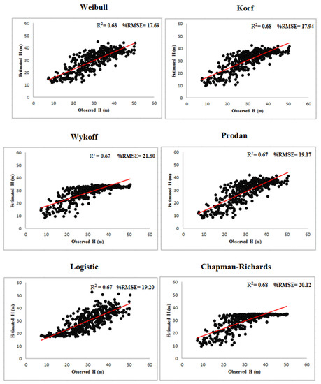 The coefficients of the empirical models are noted in Table 5; the modeling results indicate that the variation in the independent variable (DBH) described is about 64%–69% of the variation in total tree height. This reflects the development of moderately good models; however, the RMSE is quite large (18%–24%) for each model. According to the results, the Weibull model, with an R2 of 0.6875, an RMSE(%) of 18.28, and a BIAS of 1.28, seemed to be best able to estimate tree heights, even though the Curtis model had the lowest bias. When the models developed were applied to the evaluation data, the Weibull model also seemed to perform the best, as it had the highest R2 and lowest RMSE, even though the Curtis model once again had the lowest bias (Table 6). Figure 3 and Figure 4 illustrate the behaviors of the two and three-parametric models for estimating tree height based on DBH, and Figure 5 shows the behavior of the best model. Figure 6 shows the predicted height values against the actual heights obtained in the empirical models. The distributions of observed vs. estimated tree heights suggest that the power or the Weibull empirical models more reasonably estimate total tree heights from DBH measurements. The other eight models all displayed some problems in estimating either the maximum (seven of the models) or the minimum (the logistic model) total tree height. In summary, from this analysis, the Weibull model was selected as the best model among the 10 empirical models.