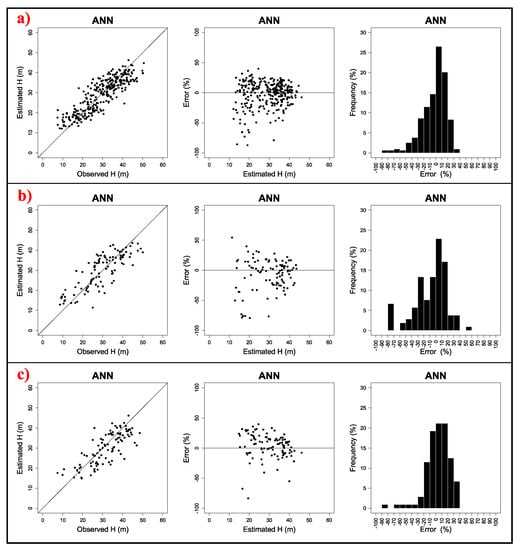 Estimated heights versus observed heights, distributions of percentage errors of height estimates, and histograms of errors of height estimates, obtained by ANN, for training (a), validation (b), and test (c) data.