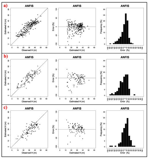 Estimated heights versus observed heights, distributions of percentage errors of height estimates, and histograms of errors of height estimates, obtained by ANFIS, for training (a), validation (b), and test (c) data.