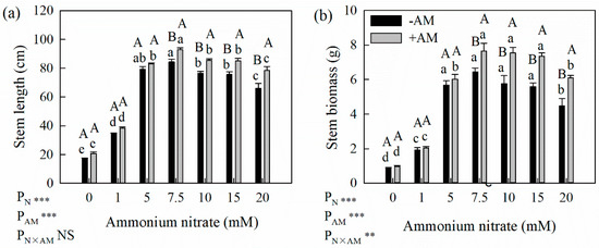 Effects of AM fungi on stem length (a) and stem biomass(b) of poplar seedlings under different N application levels. * Significant effect at p < 0.05; ** Significant effect at p < 0.01; *** Significant effect at p < 0.001; NS: no significant effect. Values are presented as the means ± SE (n = 10). Different lowercase letters indicate significant difference among different N levels with the same AM treatment and different uppercase letters indicate significant difference between +AM and −AM treatments under the same N level at p < 0.05.