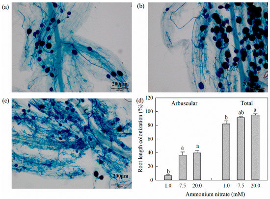 AM colonization rate in poplar roots under (a) low, (b) optimum, and (c) high N application levels, and the root length colonization (d). Values are presented as the means ± SE (n = 3). Different lowercase letters indicate a significant difference at p < 0.05 according to Duncan’s test.