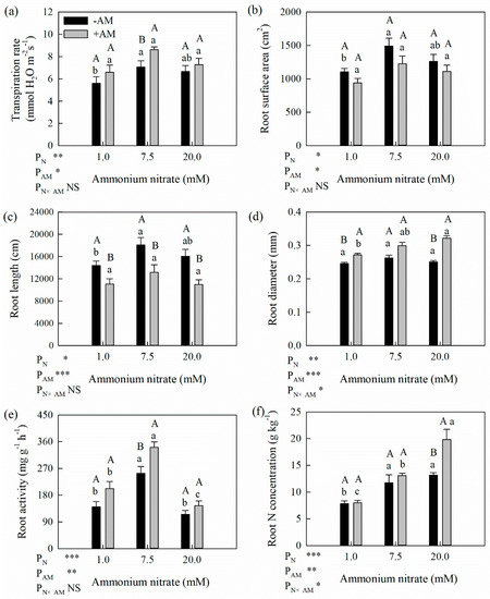 Effects of AM fungi on physiological indicators and root properties of poplar seedlings under different N application levels (a. transpiration rate; b. root surface area; c. root length; d. average root diameter; e. root activity; f. root N concentration). * Significant effect at p < 0.05; ** Significant effect at p < 0.01; *** Significant effect at p < 0.001; NS: no significant effect. Values are presented as the means ± SE (n = 3). Different lowercase letters indicate significant difference among different N levels with the same AM treatment and different uppercase letters indicate significant difference between +AM and −AM treatments under the same N level at p < 0.05.