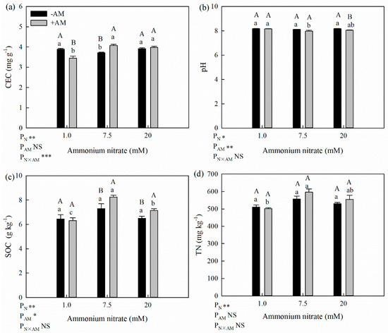 Effects of AM fungi on soil properties at different N levels (a. cation exchange capacity (CEC); b. pH; c. soil organic carbon (SOC); d. total N (TN)). * Significant effect at p < 0.05; ** Significant effect at p < 0.01; *** Significant effect at p < 0.001; NS: no significant effect. Values are presented as the means ± SE (n = 3). Different lowercase letters indicate significant difference among different N levels with the same AM treatment and different uppercase letters indicate significant difference between +AM and −AM treatments under the same N level at p < 0.05.
