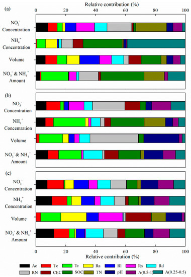 Relative contributions to data variability explanation of NO3− and NH4+ concentrations, leaching volumes and the total amount of both forms at (a) low, (b) optimum and (c) high N level, by following variables: Ac, arbuscular colonization rate; Tc, total colonization rate; Tr, transpiration rate; Ra, root activity; Rl, root length; Rs, root area; Rd, root diameter; RN, root N concentration; CEC, cation exchange capacity; SOC, soil organic carbon; TN, soil total N concentration, A(0.5–1), 0.5–1 mm aggregates; A(0.25–0.5), 0.25–0.5 mm aggregates. n = 3.