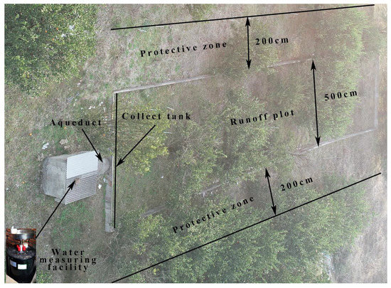 The surface runoff measurements collected for this study were based on the national standard procedure of the People’s Republic of China called “Methodology for field long-term observation of forest ecosystem (GB33027-2016)”. According to different vegetation types, three 100 m2 fixed slope runoff plots were setup to monitor slope runoff and sediment. The runoff area on the slope was 5 m wide (parallel to the contour line) and 20 m long (horizontal projection along the slope). A 2 m wide isolation protection belt was left around the runoff area on the slope (Figure 2). The water collecting tank was located at the water-retaining wall downstream the runoff area. As a supplementary monitoring method to the fixed runoff area procedure, the size of the temporary runoff area was 5 × 10 m2. The long side was perpendicular to the contour line and the short side was parallel to the contour line. The surface runoff was measured with a QT-50 mL tipper type surface runoff meter.
