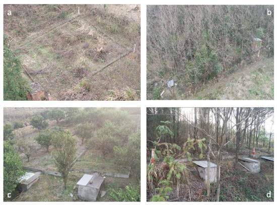 Different vegetation types were considered for this study. The list included slope farmland (SF-Figure 3a); Eucommia ulmoides forest (EUF-Figure 3b); Vernicia fordii forest (VVF); broad-leaved secondary forest (BLMF); wasteland (WL); citrus reticulata forest (CRF-Figure 3c); Pinus massoniana forest shrub (PMF); coniferous and broad-leaved mixed forest (CBMF); and broad-leaf mixed forest (BMF-Figure 3d). Crucial parameters typical of each configuration are listed and summarized in Table 1.
