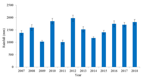 Figure 4 shows the rainfall variations from 2007 to 2018 in the basin of Nverzhai. The values in Figure 5 confirms that the 12-year rainfall rates in the Nverzhai basin were within 1007.30–1975.47 mm, with the wettest year in 2012 and the “driest” years in 2009 and 2011, when the rainfall was recorded to be below 1100 m. The average rainfall was 1373.84 mm in the first five monitored years (2007–2011) and 1622.51 mm in the last seven monitored years (2012–2018). The trend highlighted during the last seven years confirms how rainfall is relatively constant within values typical of wet years. This may also be due to the effects provided by the afforestation process established within the area, which may have contributed to improve the local climate. Although some authors believe that these considerations may be correct, it is possible that the short time period (2012–2018) was too short and that more times is needed to characterize rain pattern changes.