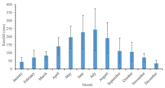 Focusing on the contribution within each month, as shown in Figure 3, the highest value of rainfall recorded was for July (243.93 ± 129.70 mm) while the lowest rainfall value was obtained in January and December (43.64 ± 27.42 mm and 34.63 ± 19.38 mm, respectively). The collected datasets show how rainfall gradually increased from January to the highest value in July, then decreased until December. The rainfall recorded in July was 5.59 and 7.04 times higher than the one recorded in January and December.