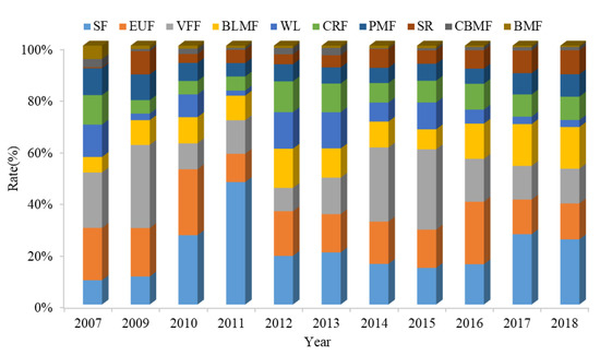Contributions from each vegetation type between 2007 and 2018 (%).