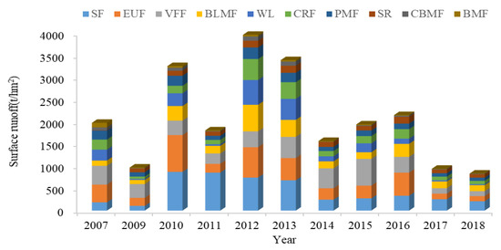 Figure 6 shows how vegetation cover changed over the investigated time period (2007–2018). Table 2 displays the contribution to runoff generation of each forest type. Figure 7 presents values of surface runoff generated by each vegetation type. Our results (Table 3) confirmed that the surface runoff contribution caused by slope farmland is the largest, whereas the surface runoff generated by the broad-leaved mixed forest is the smallest.