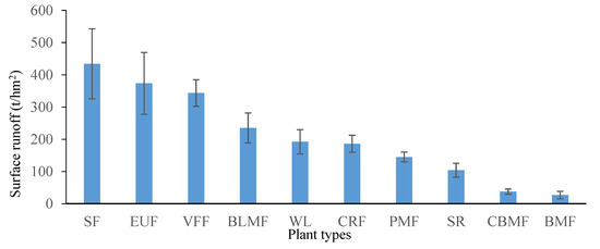 Wang et al. [1] previously simulated the variation of surface runoff for Quercus acutissima forests and found that it was smaller than the surface runoff measure for grassland. This study also found that the surface runoff and sediment yield associated with vegetation covers characterized by large surface areas such as shrubs and broad-leaved mixed forests were smaller than those measured for forests with small surface coverage such as sloping farmland. This is because the surface of the first configuration is typically covered by a large number of vegetation and litter, which is why rainwater that reaches the ground is intercepted. The results of this study are also consistent with what was found by Lv et al. [38], who stated that under the natural rainfall condition the surface runoff of forest land (360.3 m3/hm2) is smaller than that typical of wasteland (900.9 m3/hm2).