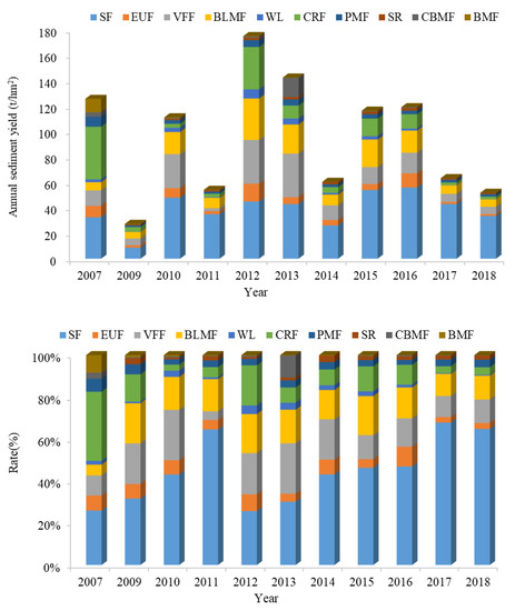 The annual sediment yield and the contributions from each vegetation type between 2007–2018 are shown in Figure 9. Overall, from 2007 to 2013, the annual sediment yield of different vegetation types was relatively large and the highest annual sediment yield was 175.19 t/hm2, as recorded in 2012 (Table 4). After 2013, the annual sediment yield of different vegetation types slightly reduced and the annual sediment yield was below 120 t/hm2, which confirmed that the soil loss had slowed down in recent years. Moreover, the sediment yield of the basin has reached a stable point under control. By comparing contributions provided by different vegetation types (Table 5), the annual sediment yield of sloping farmland was the largest (35.38 t/hm2 and 32.04 t/hm2 in 2007–2013 and 2014–2018, respectively), while the contribution from broad-leaved mixed forest was the smallest (2.05 t/hm2 in 2007–2013 and 0.15 t/hm2 in 2014–2018). The annual sediment yield in 2018 was 70.39% less than the one recorded in 2012. This value is a clear sign that due to the recent recovery and growth induced by the afforestation, the surface erosion slowed, sediment content significantly reduced, and soil developed stronger capabilities to store and conserve water.