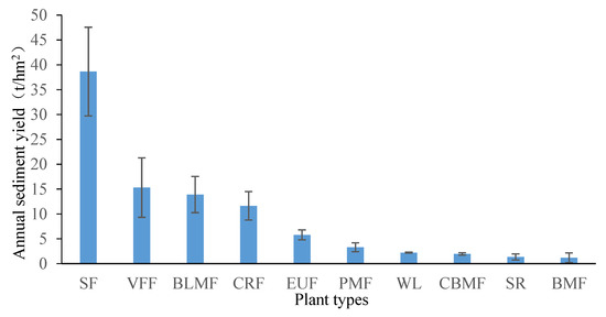 The overall contribution to sediment yield due to different vegetation types is shown in Figure 10. It can be seen from Figure 10 that the sediment content in sloping farmland is the largest (38.64 ± 8.91 t/hm2), it is followed by the Vernicia fordii forest (15.30 ± 5.98 t/hm2) and the broad-leaved secondary forest (13.90 ± 3.65t/hm2). The smallest contribution is associated to the broad-leaved mixed forest (1.19 ± 0.98 t/hm2), the shrub configuration (1.35 ± 0.61 t/hm2), and the coniferous broad-leaved mixed forest (1.96 ± 0.25 t/hm2), which is not far from the contribution of the wasteland configuration (2.21 ± 0.10 t/hm2). The sediment content of sloping farmland is 32.57 times higher than the rate generated by the broad-leaved mixed forest. This certifies that sloping farmland is more likely to produce soil erosion, which produces a large number of surface runoff that results in an increase of soil loss. Mixed forest land (broad-leaved mixed forest is the strongest), however, has strong soil and water conservation capacity.
