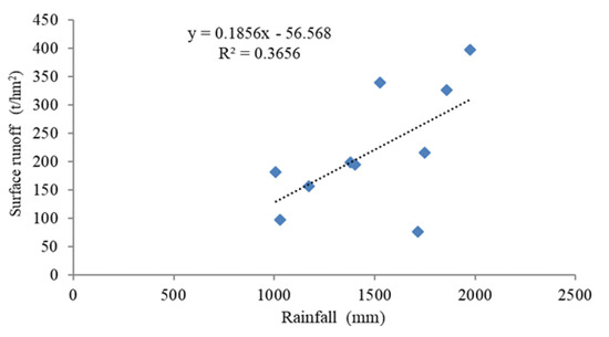It can be seen from Figure 11 that there could be an approach to a linear correlation between rainfall and surface runoff (R2 = 0.36). When the surface runoff is 97.19 t/hm2, the rainfall is 1028.72 mm. As the rainfall increases, the surface runoff also increases. When the rainfall is 1856.60 mm, the surface runoff is 326.37 t/hm2 and when the rainfall is 1975.47 mm, the surface runoff is 396.92 t/hm2. This proves that the formation of surface runoff could be directly related to the size of rainfall. In order to reduce the direct erosion induced by the rainfall on the surface, a large number of trees with strong impact resistance (such as broad-leaved trees, with more litter) should be planted, to increase the surface roughness and reduce water and soil loss. However, the interaction rainfall-runoff is dynamic and depends on the relationship between rain intensity, soil infiltration, and surface storage. Runoff occurs whenever rain intensity exceeds the infiltration capacity of the soil, providing there are no physical obstructions to surface flow. Considering the complexity of this dynamic interaction, peaks observed outside the trend identified could be influenced by one of these factors.