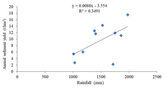 It can be seen from Figure 12 that there may be a linear correlation between rainfall and annual sediment yield (R2 = 0.35). When the annual sediment yield is 2.74 t/hm2, the rainfall is 1028.72 mm. With rainfall increases, the annual sediment yield increases gradually. When the rainfall is 1856.60 mm, the annual sediment yield is 11.13 t/hm2; when the rainfall is 1975.47 mm, the annual sediment yield is 17.52 t/hm2. This shows that the formation of sediment yield is directly related to the amount of rainfall.