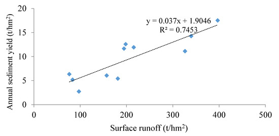 Finally, it is possible to observe from Figure 13 that there is a significant positive correlation between surface runoff and annual sediment yield (R2 = 0.75). When the annual sediment yield is 2.74 t/hm2, the surface runoff is 97.19 t/hm2. With the increase of surface runoff, the annual sediment yield increases gradually. When the surface runoff is 396.92 t/hm2, the annual sediment yield is 17.52 t/hm2. This confirms that the formation of sediment yield is not only directly related to rainfall but may be also associated with hydraulic processes of surface runoff.