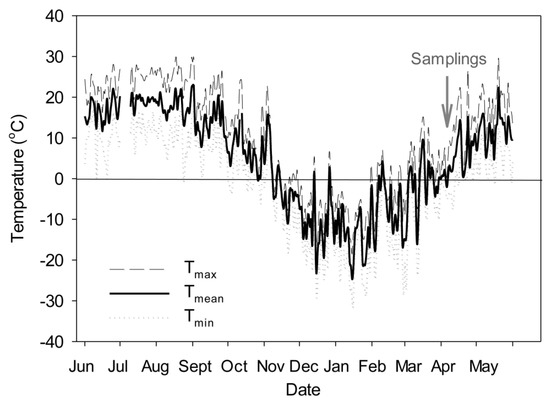 The Aspen FACE facility is located close to Rhinelander, WI, USA (45.6° N, 89.5° W). In 1997, rooted cuttings of aspen (Populus tremuloides), and seedlings of paper birch and sugar maple (Acer saccharum) were planted on approximately 32 ha containing 12 experimental rings (30-m diameter): 3 replicates of control (ambient CO2 (aCO2) and ambient O3 (aO3)), elevated CO2 (eCO2, target of 560 ppm) and elevated O3 (eO3, target 1.5 × ambient), or a combination of eCO2 and eO3. The three replicates were blocked across northern, central, and southern regions of the site, i.e., each block contained one replication ring of each treatment. The experiment was a full-factorial design. The present study used birch trees. Fumigation began in the spring of 1998 and continued during daylight hours for 11 growing seasons through 2008, from bud break until leaf fall [36]. In the growing season prior to the sampling for the present experiment (April 3–4, 2009), the exposures were started on May 23 and terminated on October 9, 2008. Carbon dioxide and O3 were applied daily according to sun angle (about 30 min post-sunrise to pre-sunset). Ozone fumigation was interrupted when maximum temperature was projected to be below 15 °C or when foliage was wet. The monthly average concentrations in the growing season 2008 are shown in Table 1. The temperature conditions between June 2008 and May 2009 are shown in Figure 1. More details on the field site, experimental design and performance are available elsewhere [36,37].