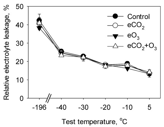Effect of elevated CO2 (eCO2), elevated O3 (eO3) and eCO2 + eO3 on the relative electrolyte leakage (REL) in the paper birch buds after the freezing test. The buds were sampled on May 4, 2009, after 11 growing seasons of the exposure treatments (1998–2008). Mean values (± SE, n = 3) are presented.