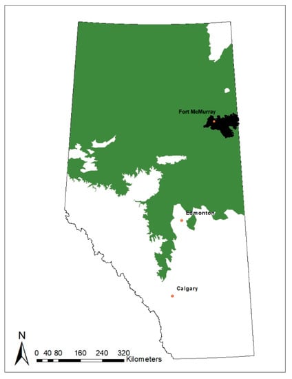 Map of field study area. Green area is the boreal forest within Alberta, Canada, while the black area is the Horse River fire, which burned an area of 589,617 ha in 2016.