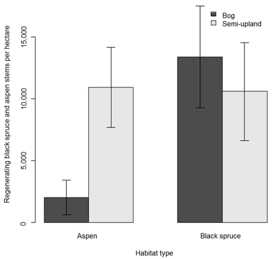 Across all burned black spruce stands, regeneration was primarily comprised of black spruce (60%) and aspen (32%). However, balsam poplar (Populus balsamifera L.) and jack pine (Pinus banksiana Lamb.) were also present in small numbers (7% and 1%). Black spruce regeneration was highly variable, ranging from 0 to 43,000 stems ha−1 in bogs and 0 to 39,500 stems ha−1 in semi-upland forests. Aspen regeneration was also highly variable, ranging from 0 to 17,000 stems ha−1 in bogs and from 0 to 36,000 stems ha−1 in semi-uplands. There was no significant difference in black spruce regeneration across the two habitat types ( = 13,375; = 10,583 stems ha−1; p = 0.698), however semi-upland habitats allowed for significantly greater aspen regeneration via root suckers ( = 8000; = 43,667 stems ha−1; p = 0.011; Figure 2). In the unburned controls, black spruce regeneration averaged 3667 stems ha−1 and was concentrated in the bog habitats.