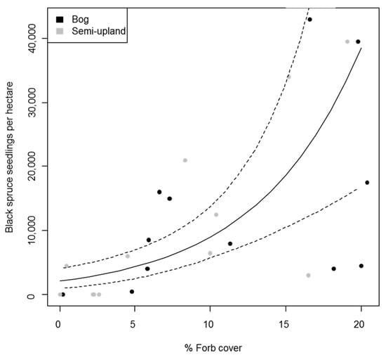 Black spruce regeneration was positively correlated with forb cover (β = 1.448, p < 0.001, pseudo R2 = 0.396). For each 10% increase in forb cover, there were approximately 8500 more regenerating black spruce seedlings ha−1 (Figure 3). Aspen regeneration was greater in semi-upland habitats, but was not affected by stand and site characteristics, including basal area, tree height, tree age, competition levels, or soil properties.